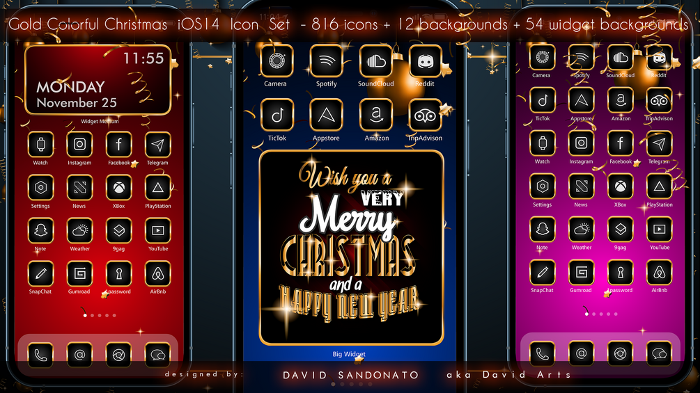 Gold Colorful Christmas iOS14 Icon Set - 816 icons + 12 backgrounds + 54 widget backgrounds