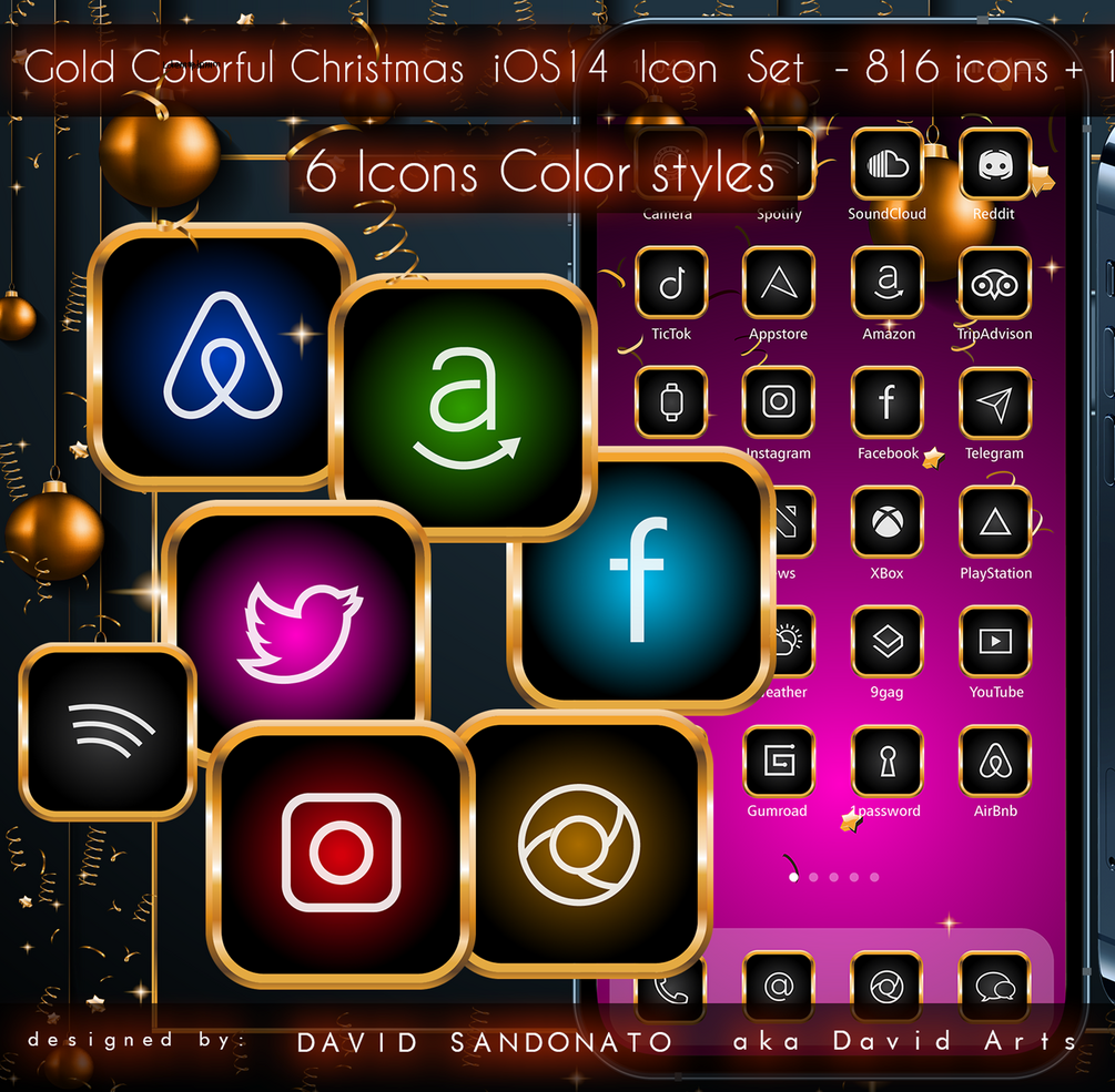 I have designed this beautiful Gold Colorful Christmas iOS14 Icon Set - 816 icons + 12 backgrounds + 54 widget backgrounds to customize your iPhone homescreen. You have 6 different Colors for each set of 136 icons!