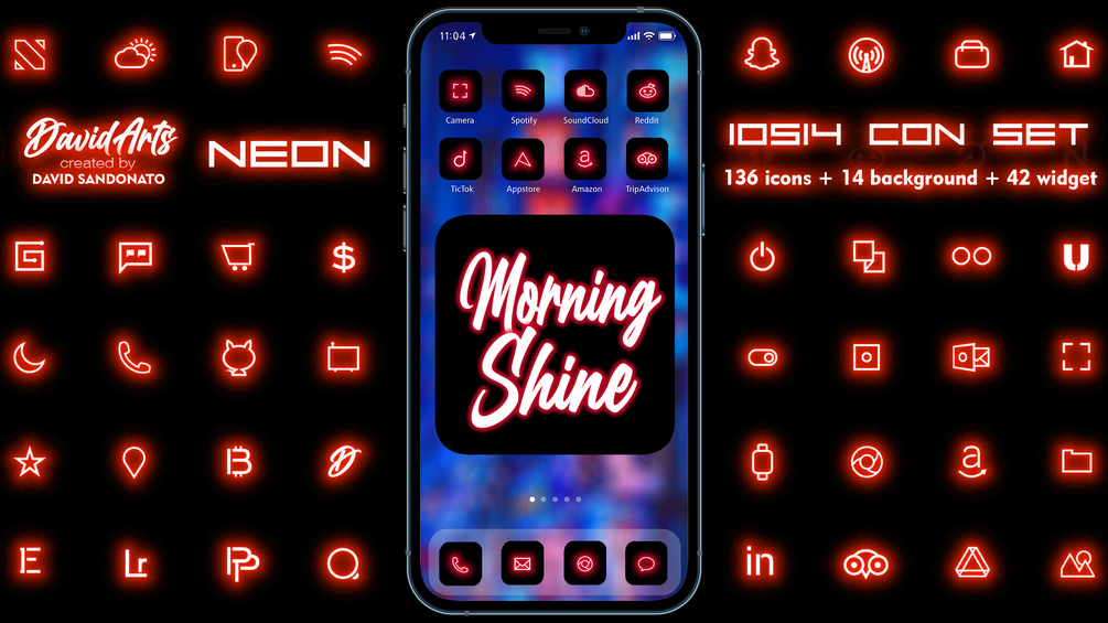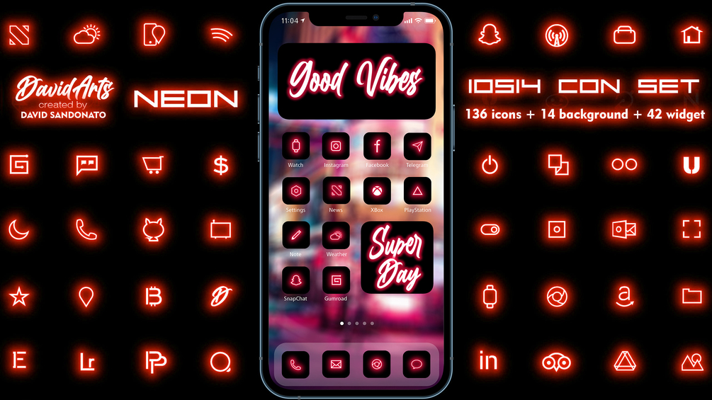 I have designed this ultra NEON Minimal Red tone iOS14 Icon Set that includes 136 icons , 14 backgrounds and 42 widget photo backgrounds to customize your iPhone homescreen. There are also several kind of motivational quote widget background for a super delicate and clean look.