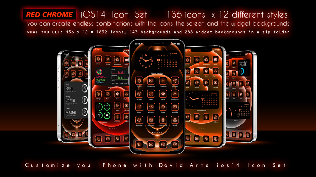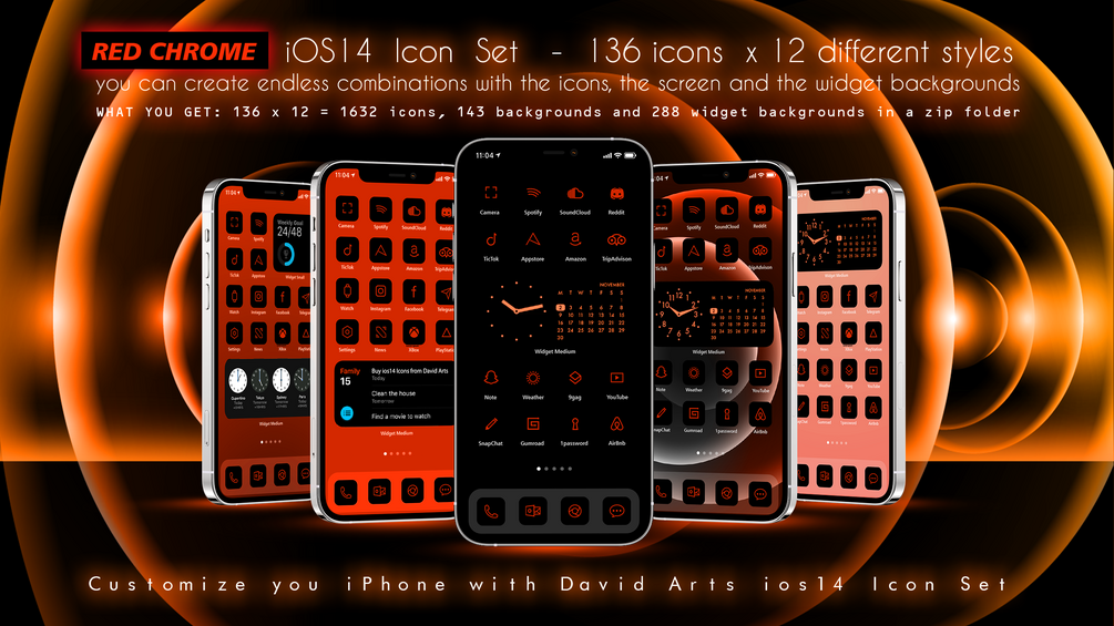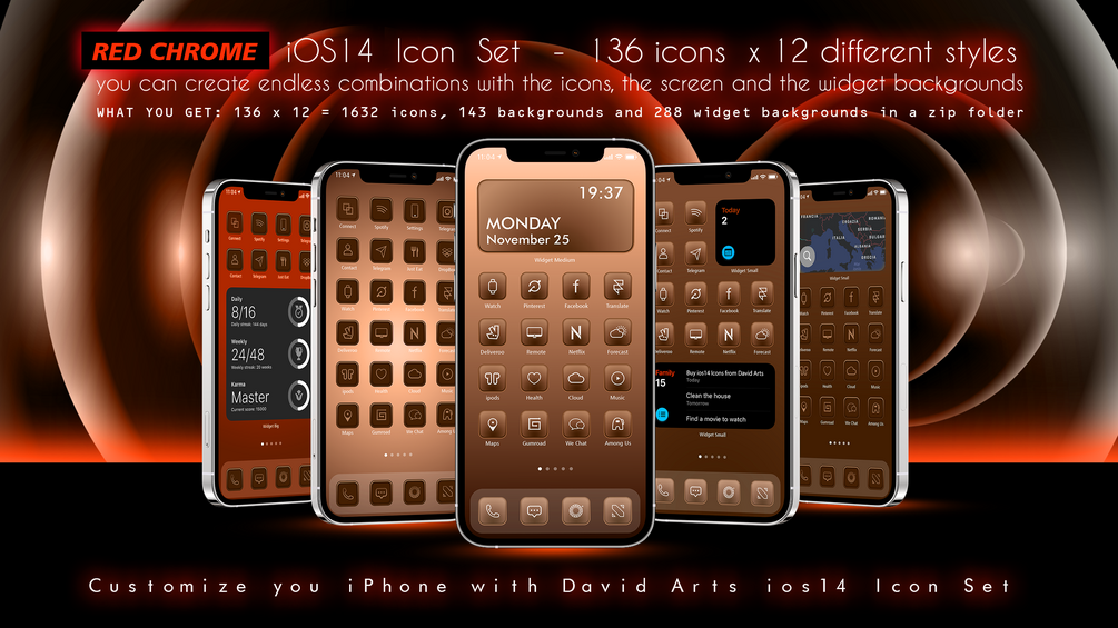 Red Chrome iOS14 Icon Set 1632 Icons - 12 different Styles iPhone homescreen customization | Brown Aesthetic | Black Widget | Photo Widgets