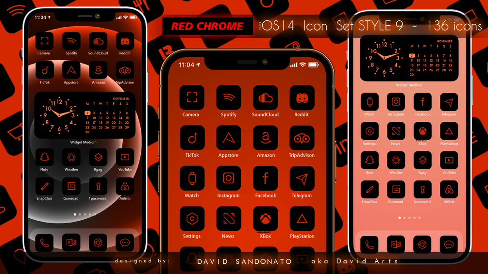 This is Red Chrome iOS14 STYLE 09 and includes 136 minimal style black and red Chrome icons and a lot of backgrounds for your homescreen and widgets.