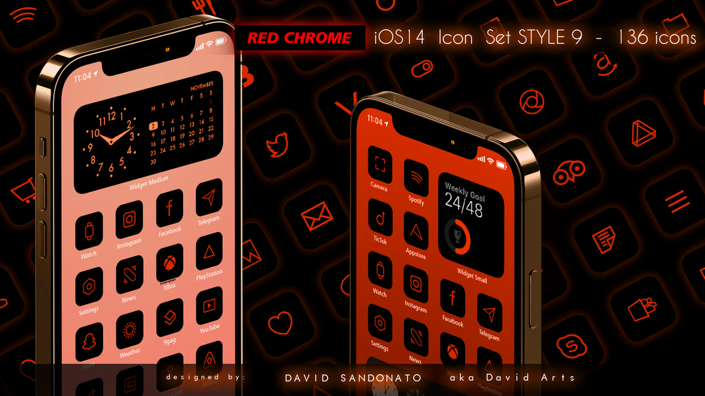 This is Red Chrome iOS14 STYLE 09 and includes 136 minimal style black and red Chrome icons and a lot of backgrounds for your homescreen and widgets.