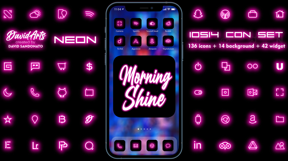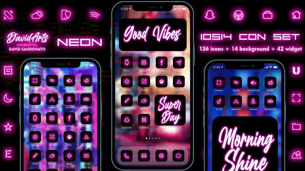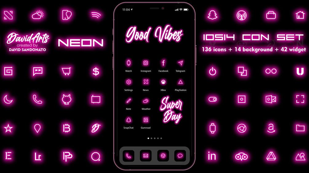I have designed this ultra NEON Minimal Pink tone iOS14 Icon Set that includes 136 icons , 14 backgrounds and 42 widget photo backgrounds to customize your iPhone homescreen. There are also several kind of motivational quote widget background for a super delicate and clean look.