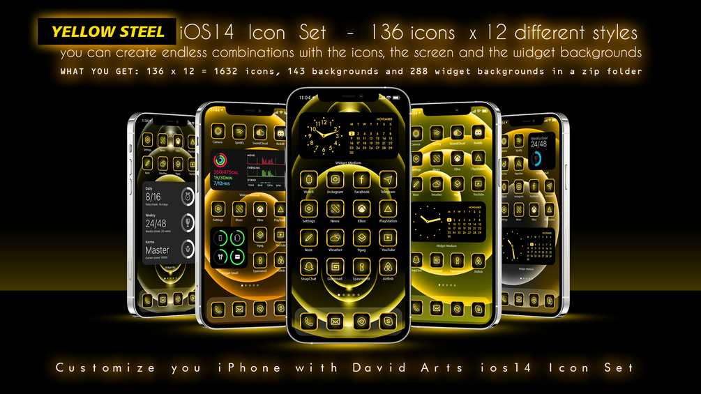 Yellow Steel iOS14 Icon Set 1632 Icons - 12 different Styles for iPhone homescreen customization | Aesthetic | Widget Smith | Photo Widgets